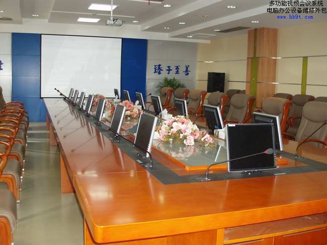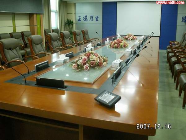 設(shè)備的分布大體是:1、每個人面前一臺可以升降的顯示器;2、每個人面前有一個鵝頸話筒;3、每個人面前有一個多功能信息插座;